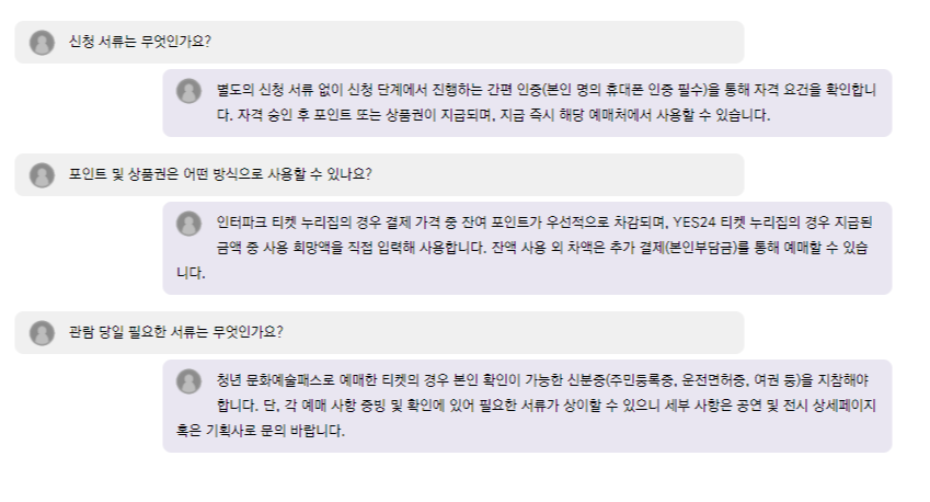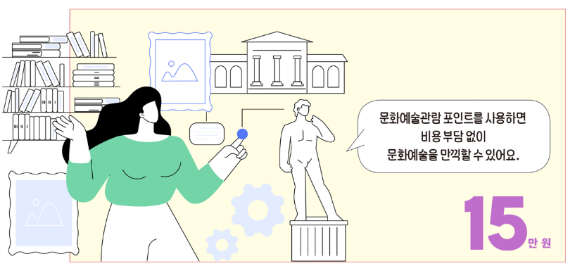 - 지급된 포인트로 음악, 무용, 연극, 미술전시, 예술영화 등 순수예술 장르의 공연 및 전시 관람 가능