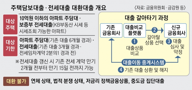 오늘부터 10억 이하 아파트 ‘대환대출’ 서비스 이용 가능 DSR 초과 땐 전환할 수 없어 31일부터 전세 대출도 적용, 스마트폰과 PC로 여러 금융사 상품을 한눈에 비교해 갈아탈 수 있는 온라인 대