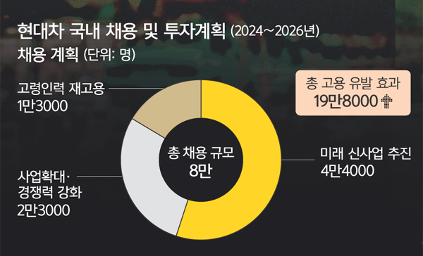 현대차그룹은 올해부터 2026년 말까지 국내에서 8만 명의 채용은 국내 취업시장에 큰 파장을 일으킬 것으로 예상됩니다. 지난해 사상 최대 실적을 기록하고 주요 그룹사 주가가 역대 최고가에 근접한 상황에서 주총자리에서 현대차그룹의 미래에 대한 구체적인 비전 제시를 요구한 데 따른 것입니다.