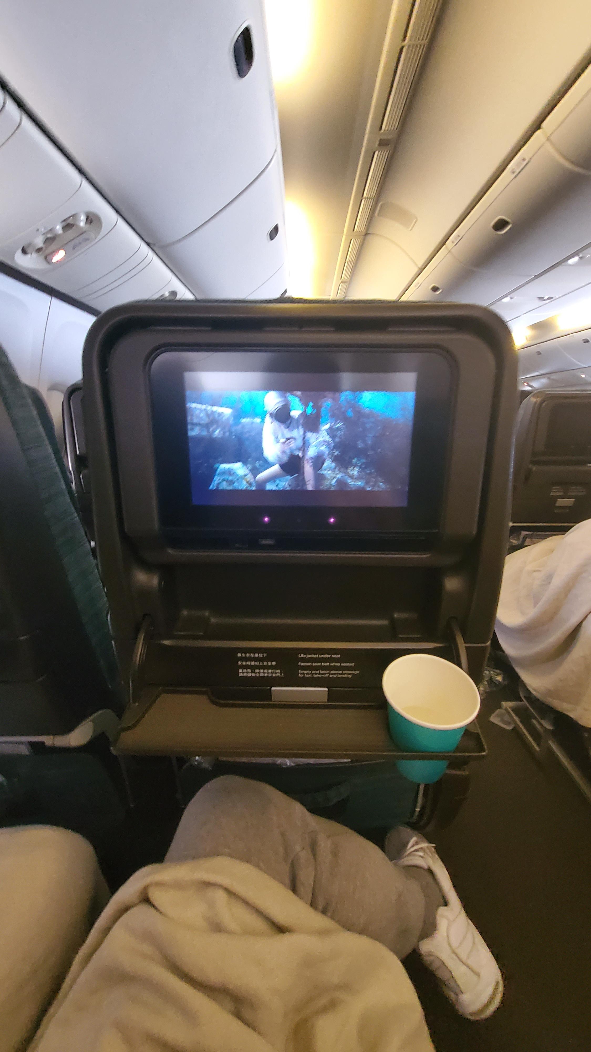 홍콩까지의 비행시간은 대략 3시간 반가량정도 되고 국외선이기에 기내식도 1회 제공됩니다. 비행기는 최신 기종답게 간결하고 깔끔했는데요. 기내의자도 기존에 비하면 많이 얇아져 레그룸도 좀 넓어졌고, 식사를 위한 테이블도 2단으로 편리해졌으며 비행 중 가장 많이 바라보는 화면 또한 넓고 또렷해져서 코로나 이전 여행 시보다 많이 쾌적한 여행이 되었던 거 같습니다.