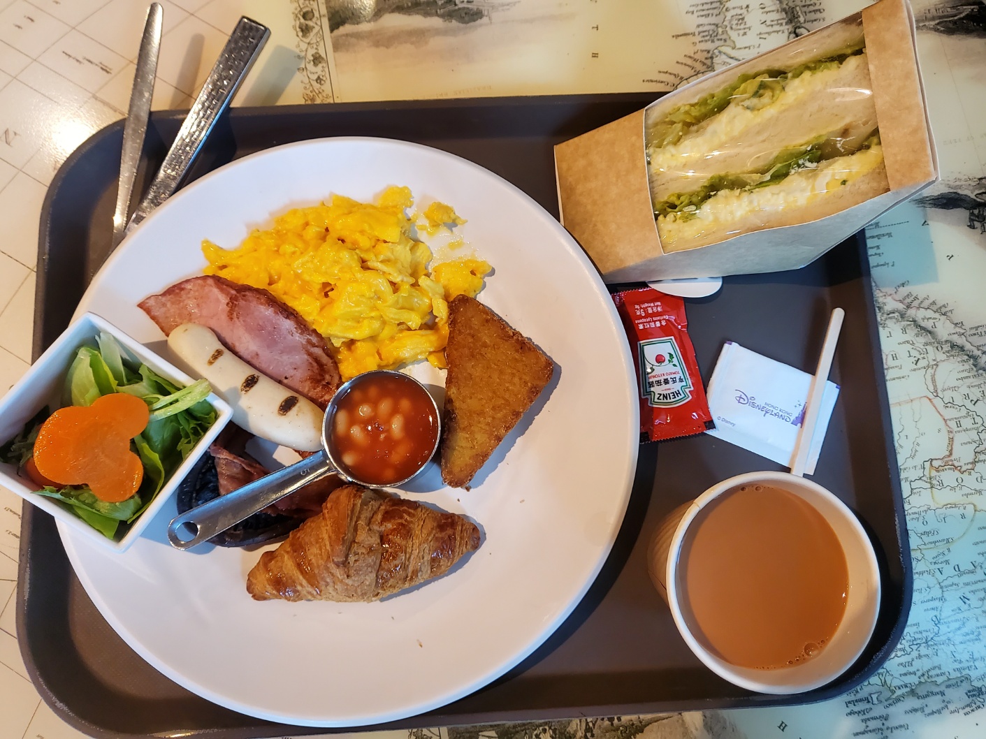 한국에서 미리 준비한 것 중에 하나였던 홍콩디즈니랜드 어트렉션 예약은 미리 해놓지 않으면 현장에서 입장하기 곤란한 상황이 발생할 수 있었습니다. 미리 준비할 때 확인한 입장 가능시간은 11시였었기에 아침 일찍 서두를 필요는 없었습니다. 아마도 디즈니랜드 호텔에서 느긋한 조식을 즐길 수 있는 시간을 주려고 하는 점도 없지 않아 있었던 거 같네요. 하지만 조식 뷔페 가격은 생각보다 사악했습니다. 캐릭터들과의 촬영등 한 번뿐인 추억을 만들고 싶은 분들은 이용해 보는 것도 나쁘지 않을 텐데요. 그러지 않고 가볍게 즐기길 원하신다면 카페 메뉴를 이용하는 것도 나쁘지 않을 것 같습니다. 가벼운 샌드위치와 미키마우스 모양의 와플 만으로도 가볍게 아침식사는 하실 수 있을 거 같습니다.