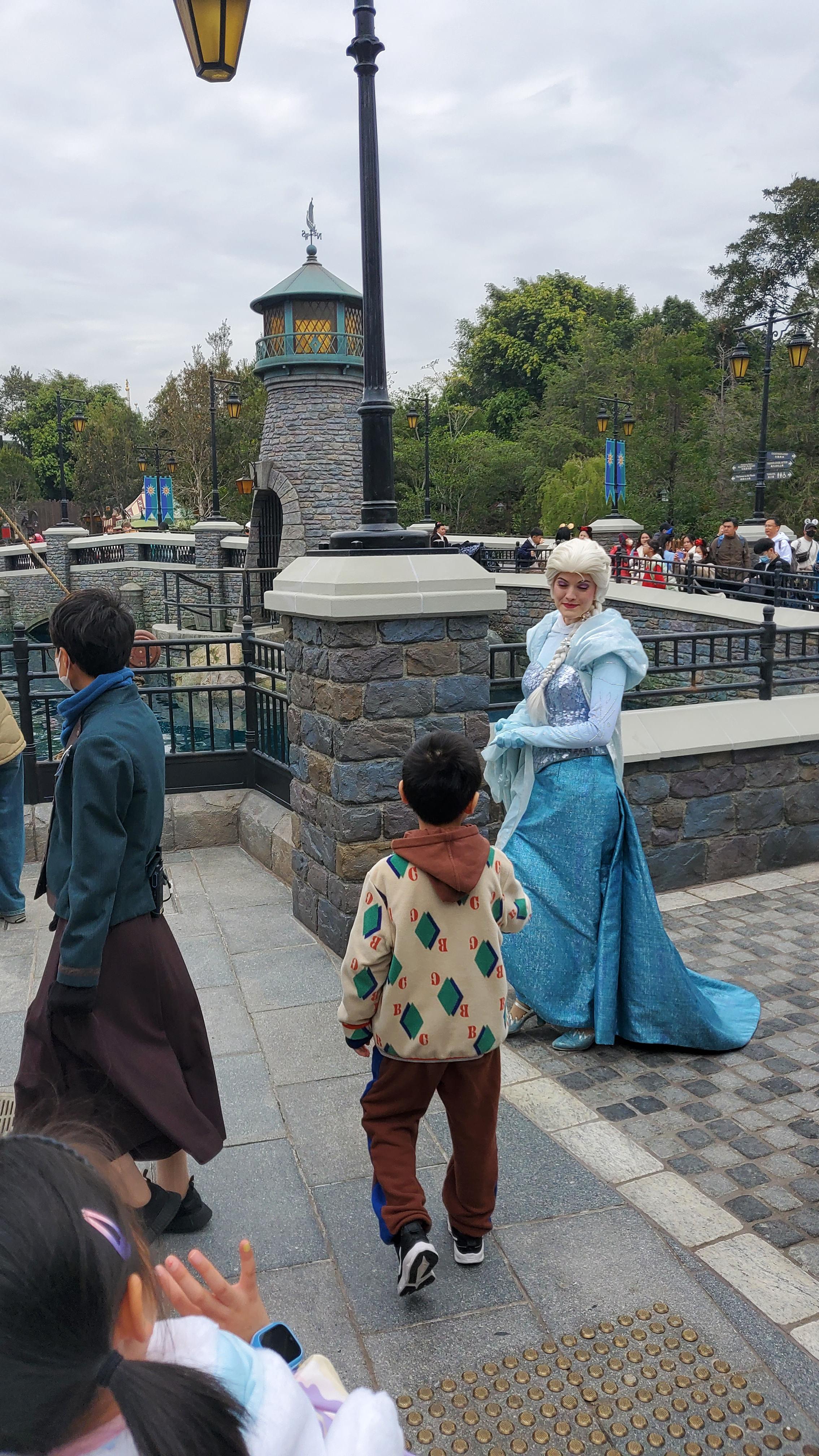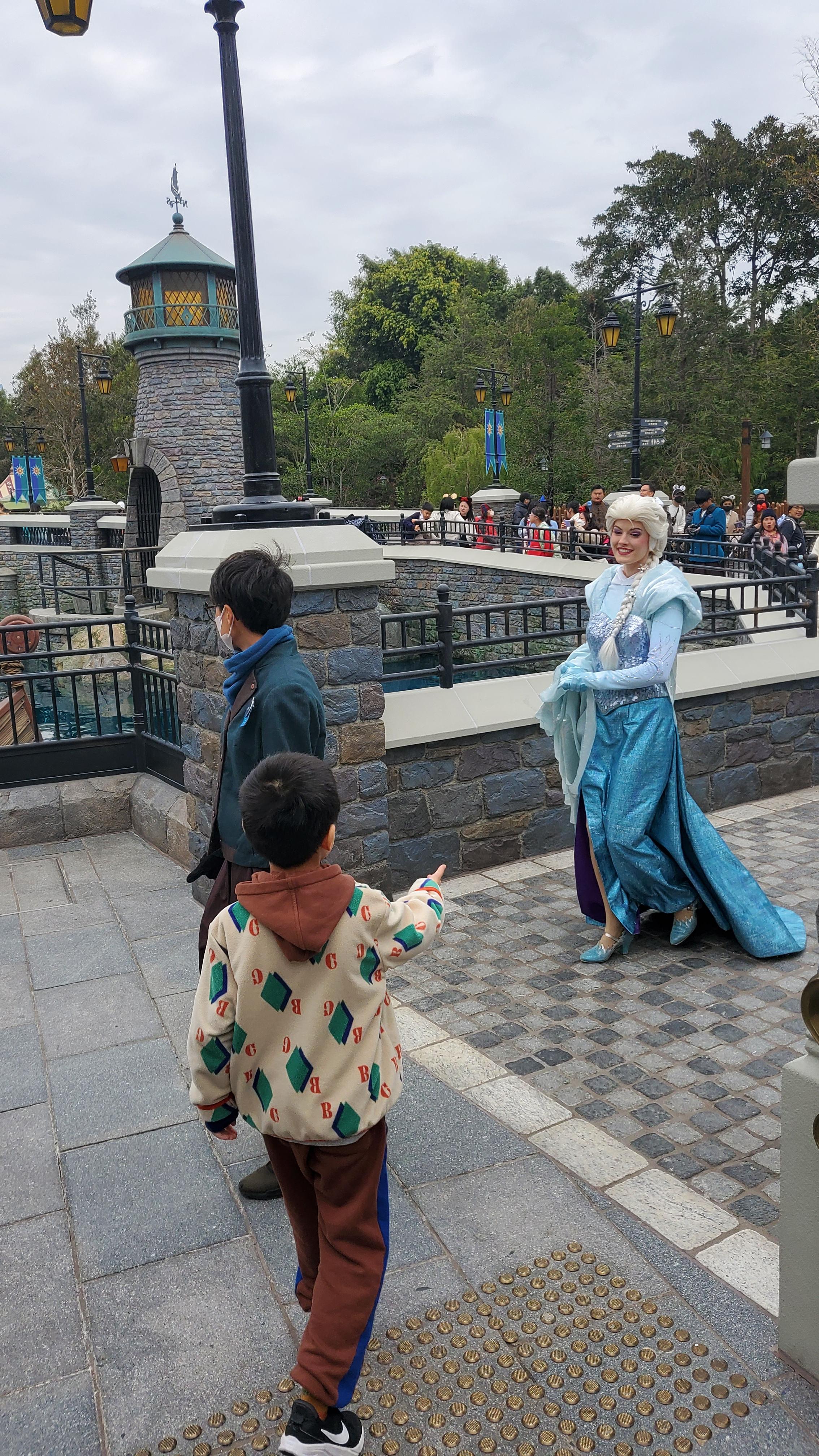 저 또한 많은 놀이기구를 탈 목적이 아니었고 디즈니랜드의 분위기를 즐기고 싶은 마음이 컸기에 애초에 크게 2가지만 꼭 이용해 볼 계획으로 입장하였습니다. 그래서 입장하자마자 세계 최초로 오픈한 겨울왕국 어트랙션 앞으로 돌격했습니다. 나머지 어트랙션은 가능하면 도전하고 아니면 말겠단 생각으로 겨울 왕국으로만 향했는데요. 다행히 오픈 초기 시간대에는 줄이 길지 않아 많이 기다리지 않고 탑승할 수 있었습니다. 또 겨울왕국 어트랙션 대기 중에 엘사가 옆으로 지나가는 행운도 있어서 촬영도 했네요.