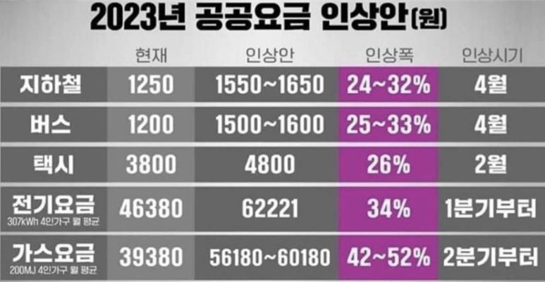 정부는 새해를 맞이하여 공공요금을 대대적으로 인상한다는 소식을 발표했습니다. 그동안 코로나 시국으로 꽁꽁 묶어두었던 공공요금을 동시 다발적으로 올리기로 한 것입니다. 대략 내용을 보면 다음과 같습니다.