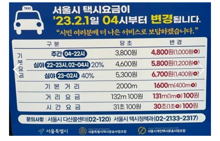 우선 선제적으로 택시비를 인상하였습니다. 기본요금 인상과 더불어 심야시간 할증을 2구역으로 나누어 달리 적용하였습니다.(서울시 택시비 기준, 경기도 수도권 미인상)