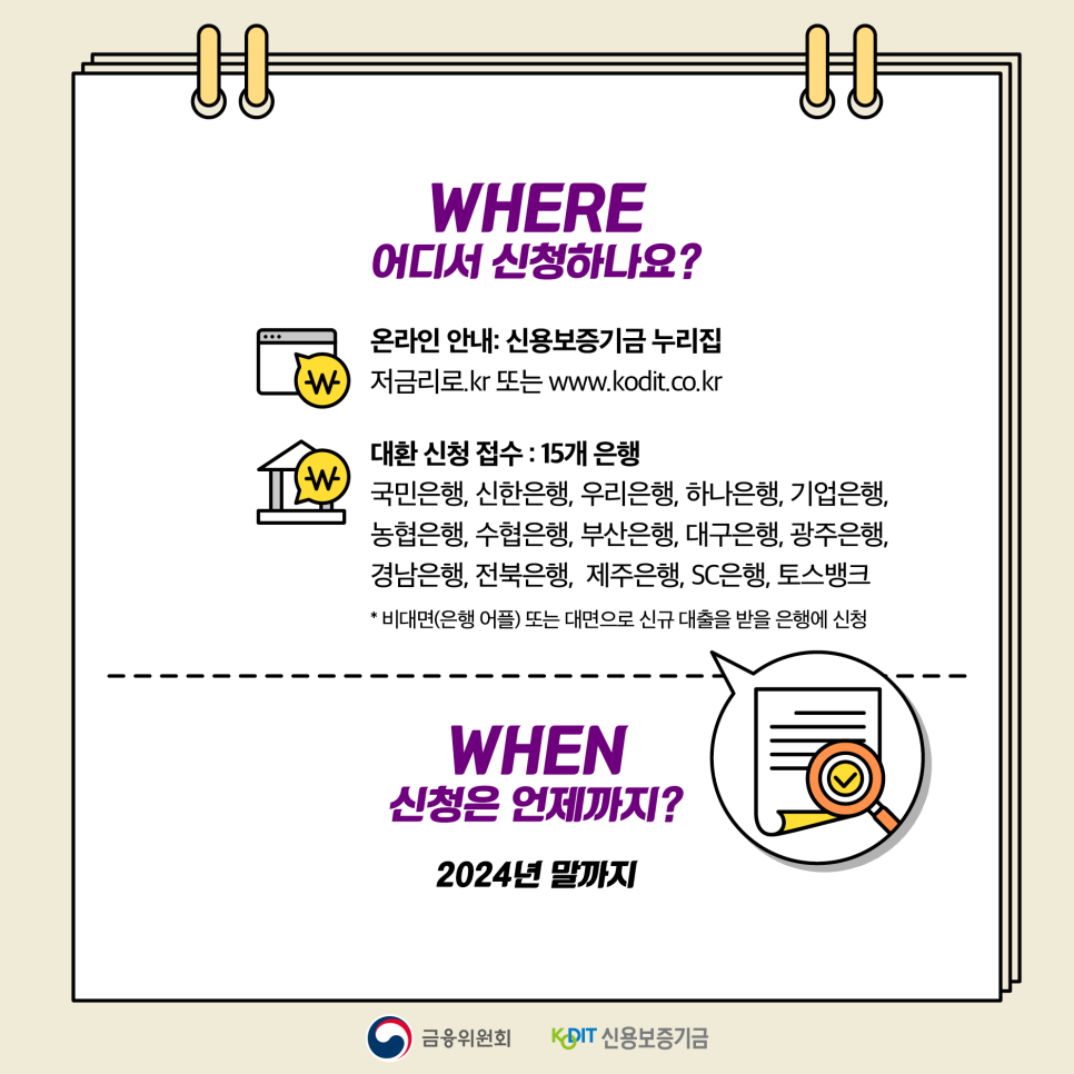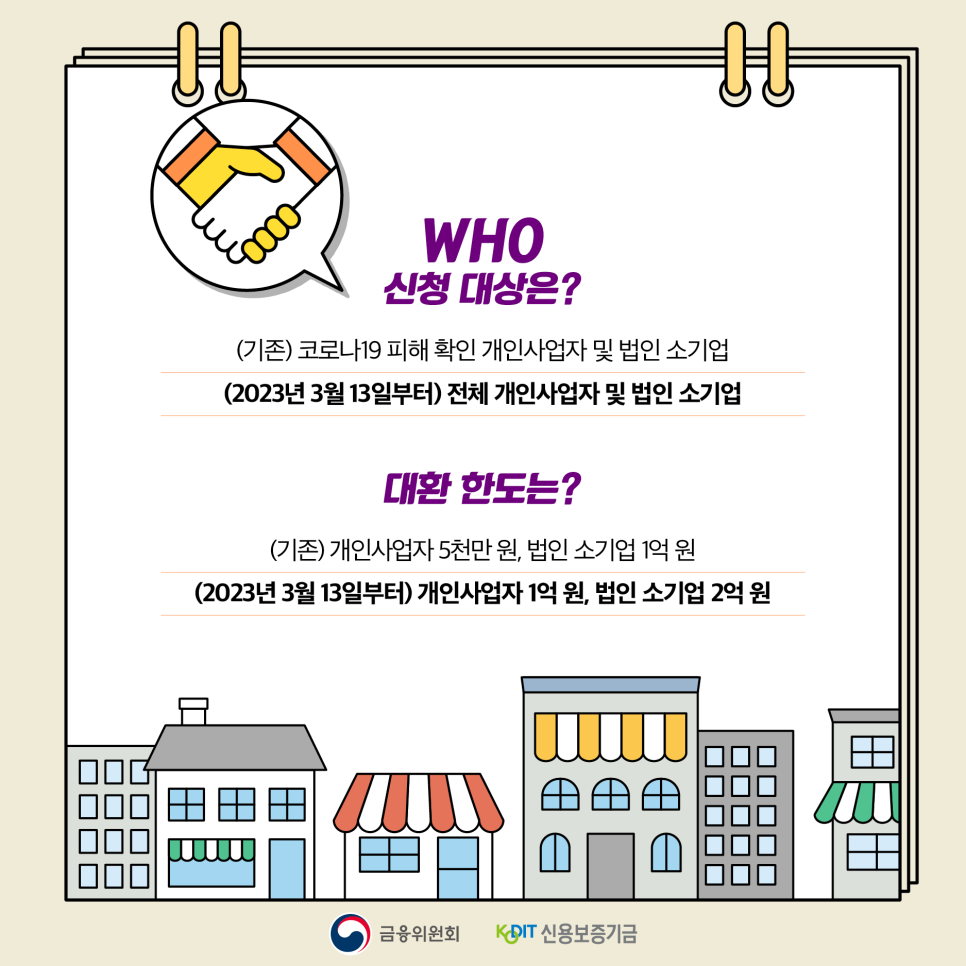코로나 19가 장기화되고 글로벌 불확실성 확대 등의 복합위기로 많은 자영업자분들이 여전히 경영상 어려움을 겪고 있어, 보다 많은 자영업자분들이 저금리 대환 프로그램을 활용할 수 있도록 세부 프로그램 내용을 개선하였습니다.